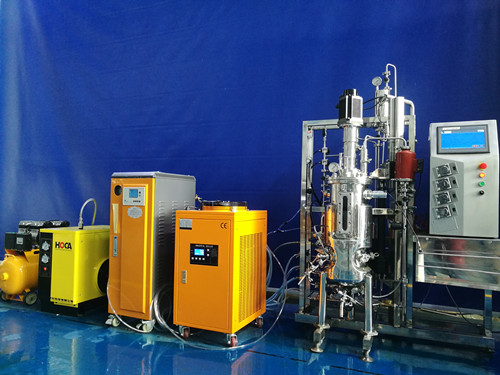 罐體功能: 約翰克蘭機械密封、進氣滅菌過濾器、排氣冷凝器、含空氣分布器的進氣系統(tǒng)、火焰接種口(也是投料口與清洗口)、放料口、取樣口、補料口;自動控制參數(shù)的五支電極分別是:PH電極、DO電極、消泡電極、溫度電極口;四臺蠕動泵自動控制分別補酸/堿/泡敵/培養(yǎng)劑;
